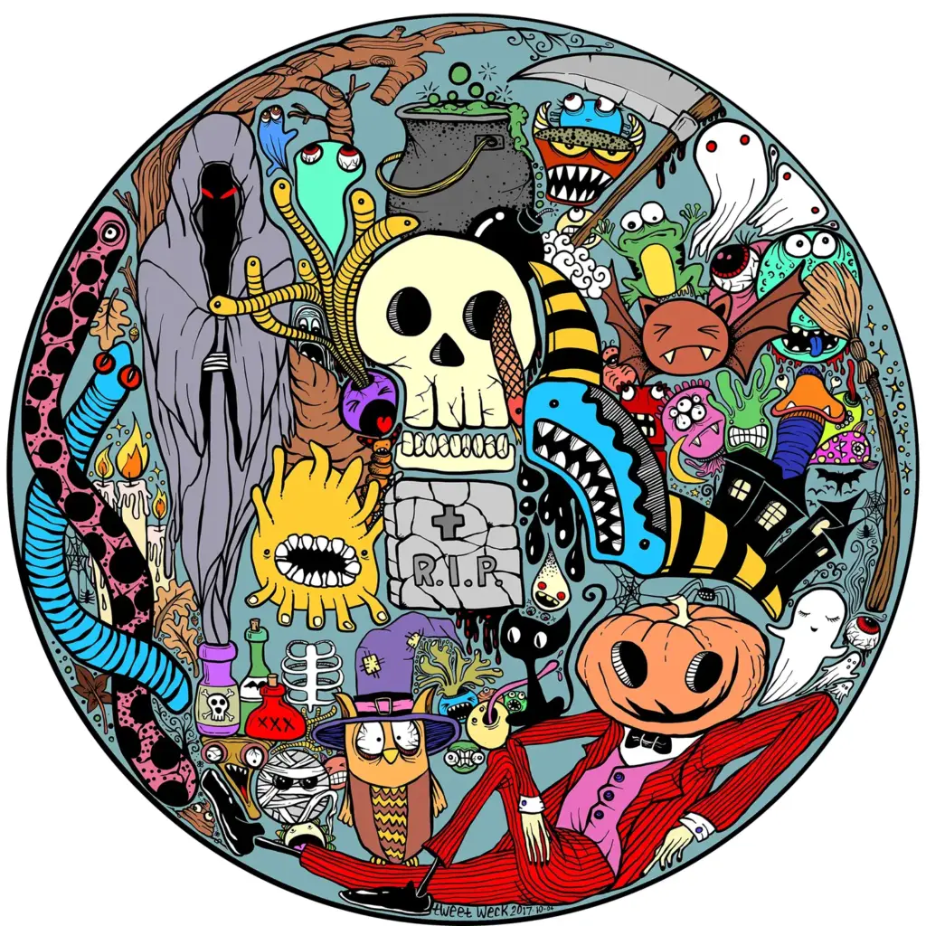 Eine lustige und schaurige Collage aus Halloween-Kreaturen, darunter Geister, Fledermäuse, Kürbisse und mehr. Perfekt für T-Shirts, Hoodies und saisonale Merchandise-Artikel. Ideal für Halloween-Fans und alle, die schaurig-verspielte Designs lieben.
